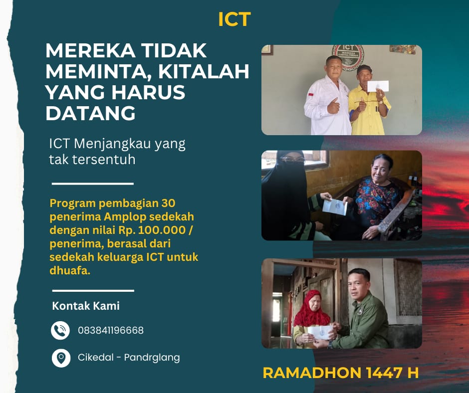 Melalui program bertajuk “Mereka Tidak Meminta, Kitalah yang Harus Datang”, ICT berupaya menjadi jembatan kepedulian antara masyarakat yang memiliki kelapangan rezeki dengan mereka yang membutuhkan. Pada tahap awal, bantuan disalurkan kepada 30 penerima manfaat dalam bentuk amplop sedekah senilai Rp100.000 per penerima yang berasal dari sedekah keluarga besar ICT. Ucap Syailendra Adi Sapta selau ketua ICT. Rabu, 18/03/2026