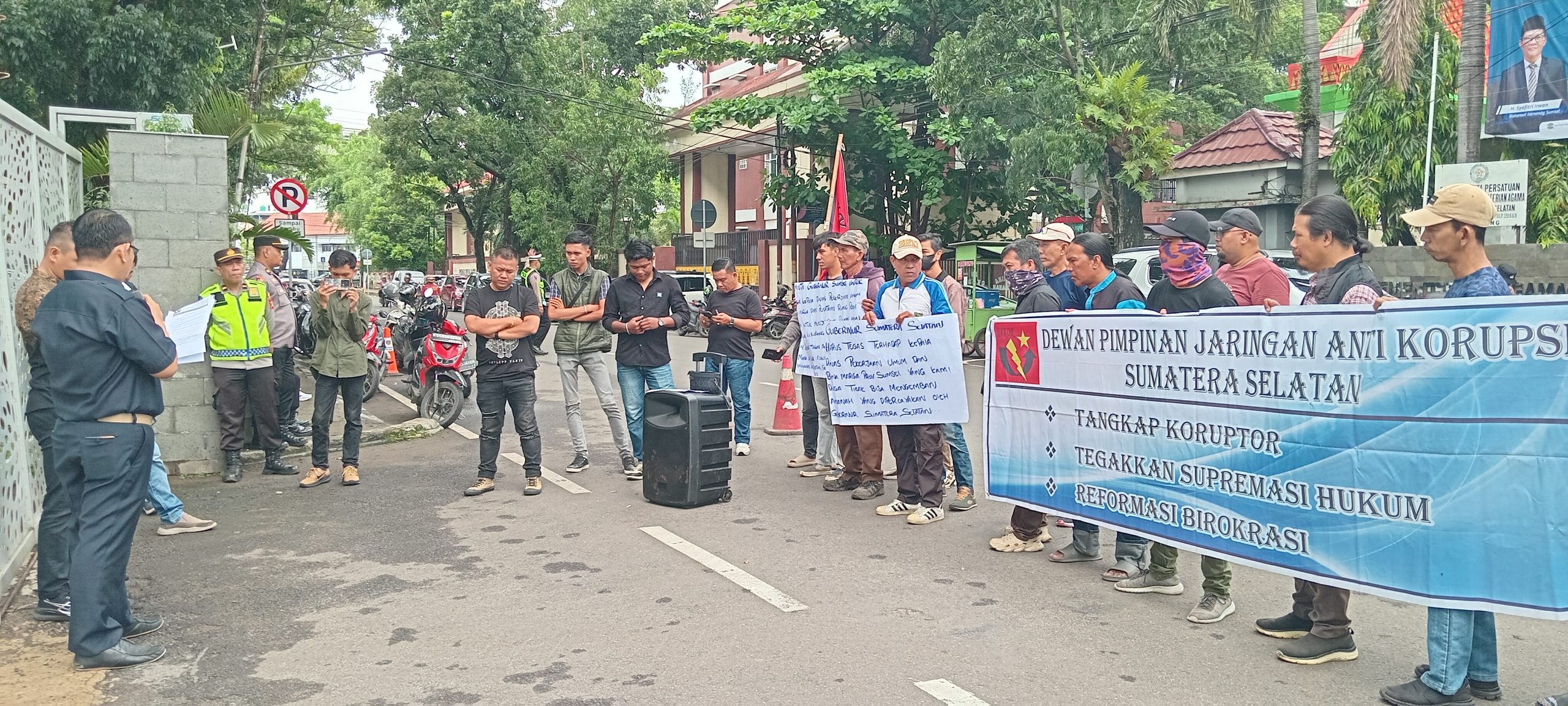 Fokusinews.com | Palembang – Puluhan massa yang tergabung dalam Dewan Pimpinan Jaringan Anti Korupsi (JAKOR) Sumatera Selatan menggelar aksi damai di Kantor Gubernur Sumsel, Kamis (23/4), menyoroti dugaan praktik korupsi, kolusi, dan nepotisme (KKN) pada sejumlah proyek infrastruktur jalan tahun anggaran 2025 di lingkungan Dinas Pekerjaan Umum Bina Marga dan Penataan Ruang (PUPR) Sumsel.