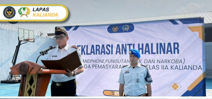 lampung Selatan – Lembaga Pemasyarakatan Kelas IIA Kalianda melaksanakan kegiatan Deklarasi Anti HALINAR (Handphone, Pungutan Liar, dan Narkoba) sebagai bentuk komitmen bersama dalam menciptakan lingkungan pemasyarakatan yang bersih, aman, dan berintegritas. Kegiatan ini dipimpin langsung oleh Kepala Lapas Kalianda dan diikuti oleh seluruh jajaran pegawai serta Warga Binaan Pemasyarakatan (20/4).
