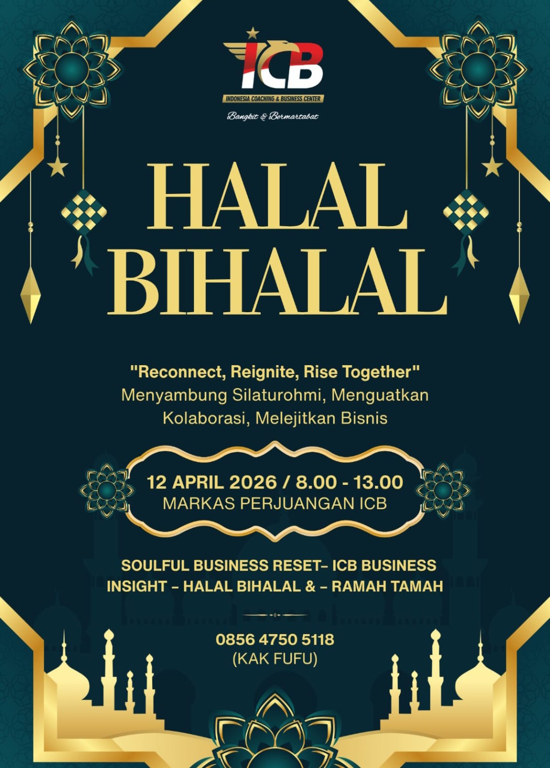 Acara akan di laksanakan pada hari Minggu 12 April 2026 ,Pukul 08.00 – 13.00 WIB. Dengan Tema ” Reconnect,Reignite,Rise Together ” Menyambung Silaturahmi,menguatkan kolaborasi,melejitkan bisnis.