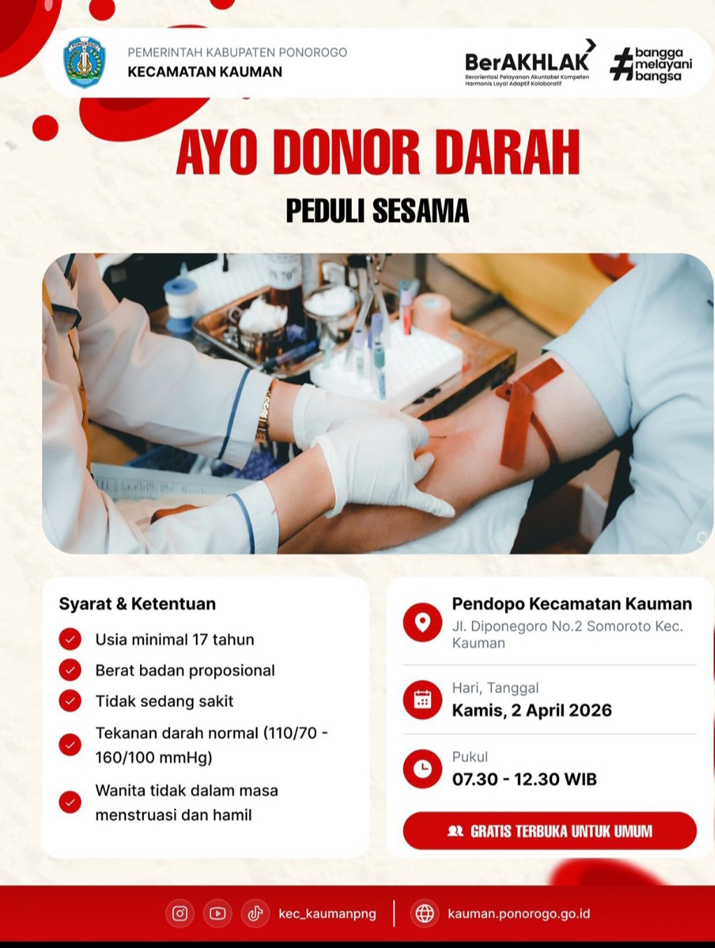 Seperti yang di lakukan oleh Kecamatan Kauman Sumoroto, Kabupaten Ponorogo ini. Dalam rangka Peduli sesama, Kecamatan Kauman Sumoroto – kabupaten ponorogo Mengadakan donor darah, Sebagai bentuk Kepedulian kita , menyumbangkan darah untuk mereka – mereka yang membutuhkan.