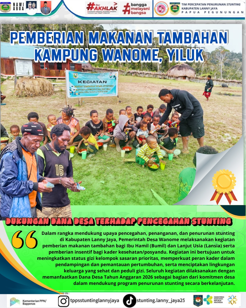 Kab Lanny Jaya ⇔ Dalam rangka mendukung Pencegahan, Penanganan, dan Penurunan Stunting di Kabupaten Lanny Jaya, Pemerintah Desa Wanome melaksanakan kegiatan intervensi spesifik dan sensitif stunting yang bersumber dari Dana Desa Tahun Anggaran 2026, dengan fokus pada kelompok sasaran prioritas, sebagai berikut: