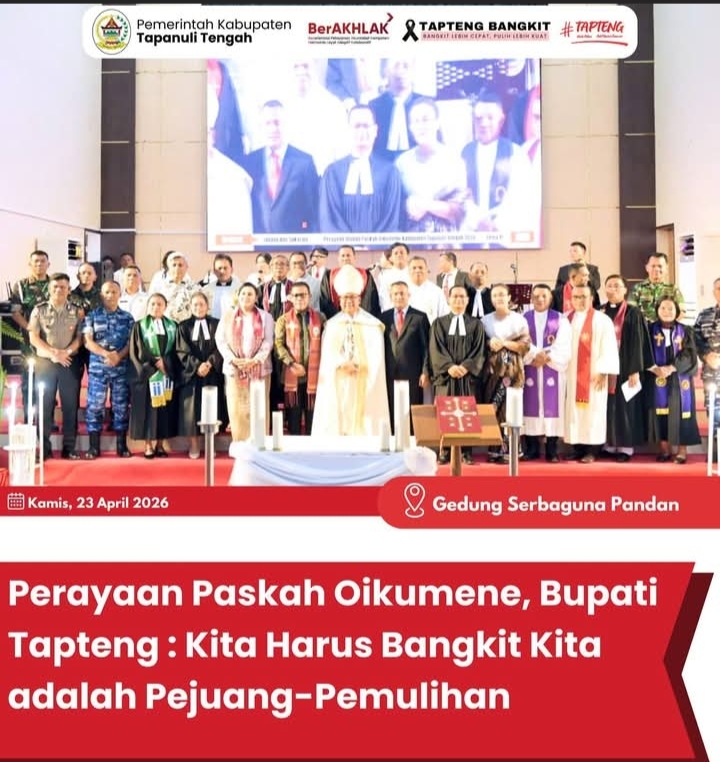 PANDAN – Pemerintah Kabupaten (Pemkab) Tapanuli Tengah (Tapteng) pada hari Kamis, 23 April 2026 bertempat di Gedung Serbaguna Pandan melaksanakan Perayaan Paskah Oikumene Kabupaten Tapteng Tahun 2026. Perayaan Paskah ini mengusung tema “Kristus bangkit membarui kemanusiaan kita (2 Korintus 5:17), dan sub tema “Tapanuli Tengah bangkit lebih kuat dalam kesederhanaan dan sukacita.”