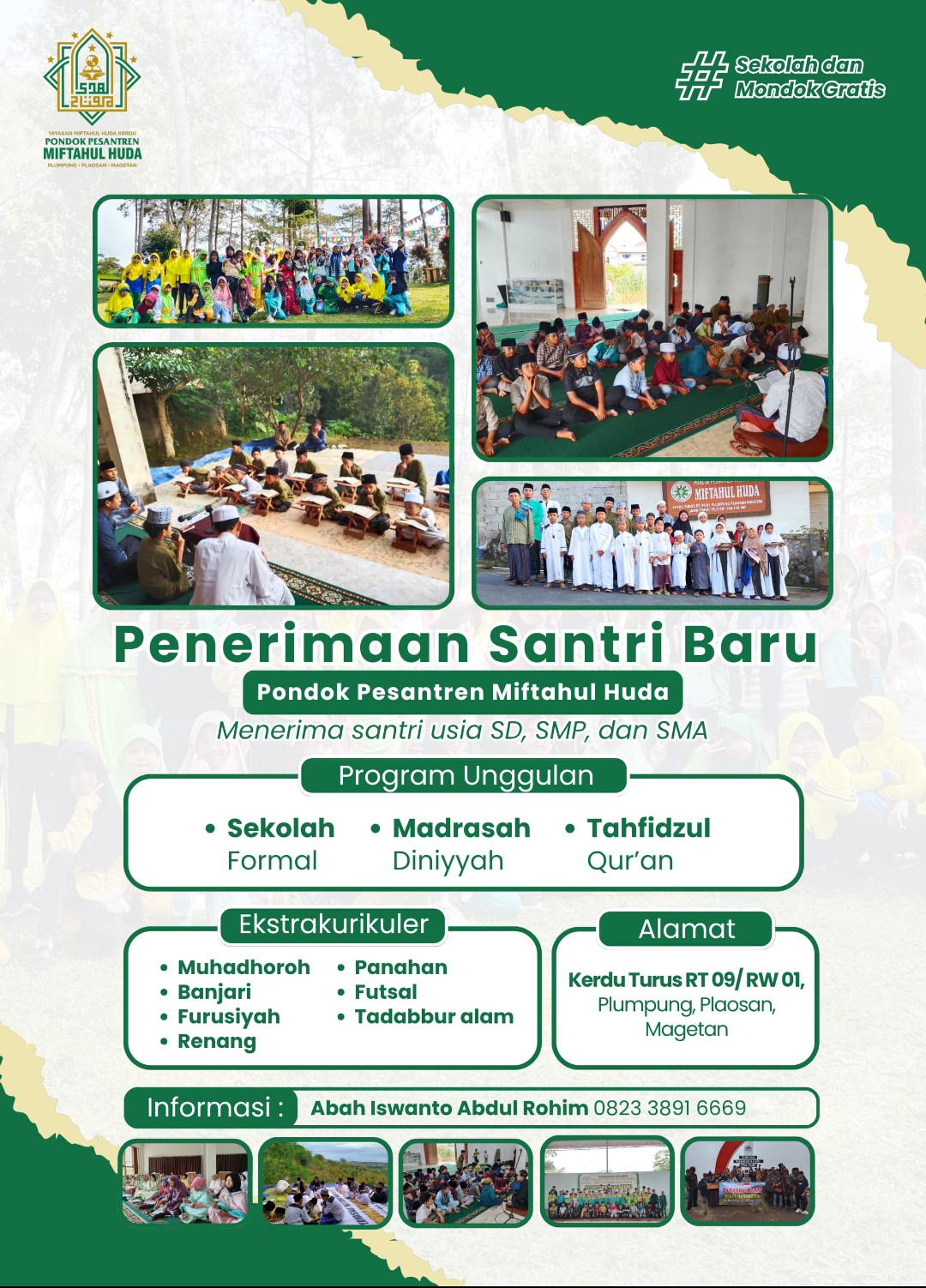 Kebetulan Kali Ini ada Penerimaan Santri Baru, Yang terdiri SD,SMP & SMA,dengan Program Unggulan : Sekolah Formal, Madrasah Diniyah & Tahfidzul Qur’an.Dengan Ekstra Kurikuler : Muhadhoroh,Banjari,Furusiyah,Renang,Panahan,Futsal & Tadabbur Alam.