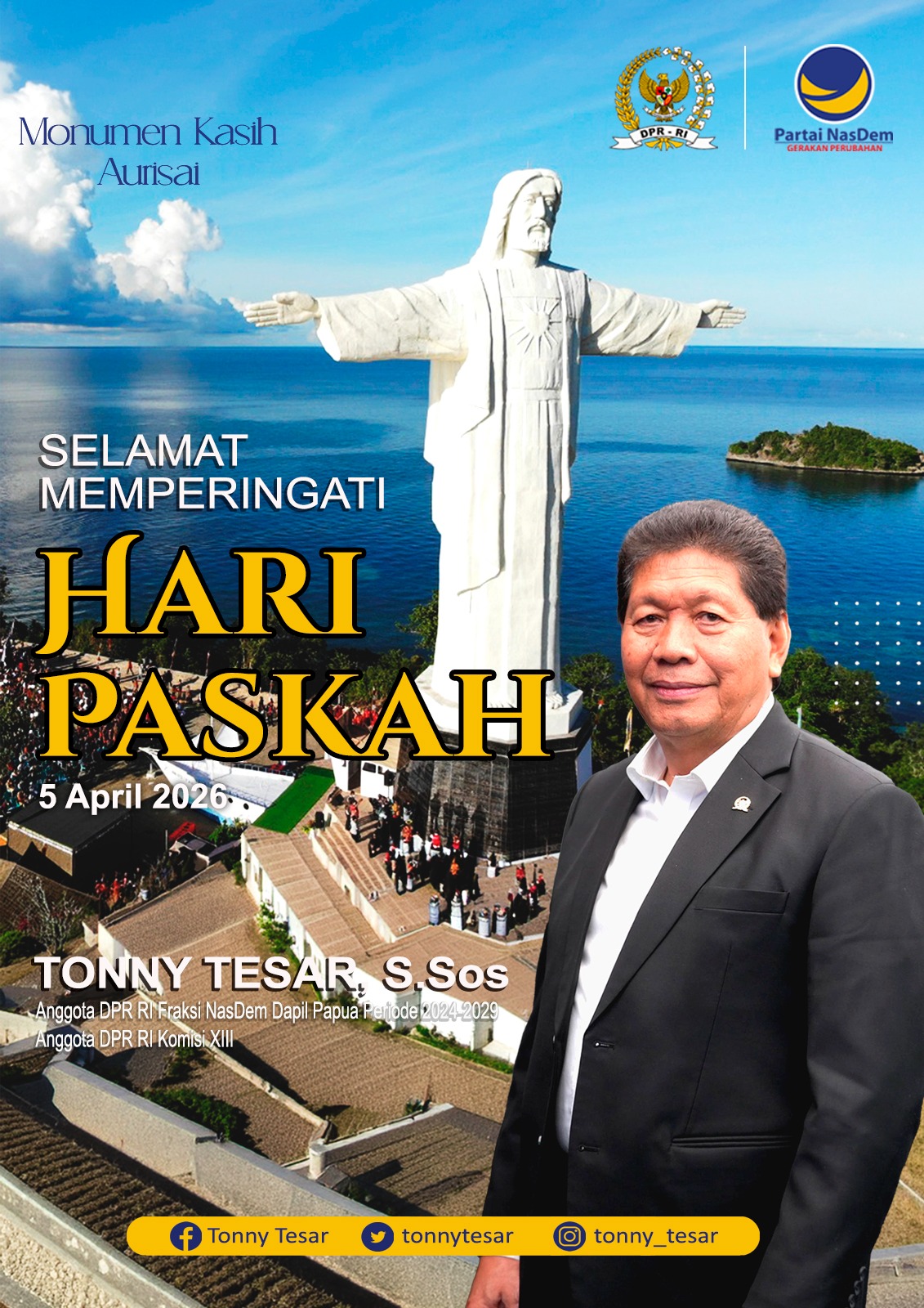 fokusinews / Papua — Dalam rangka memperingati Hari Paskah yang jatuh pada Minggu, 5 April 2026, Anggota DPR RI dari Fraksi Partai NasDem, Tonny Tesar, menyampaikan ucapan selamat sekaligus pesan damai kepada seluruh umat Kristiani, khususnya di Papua.