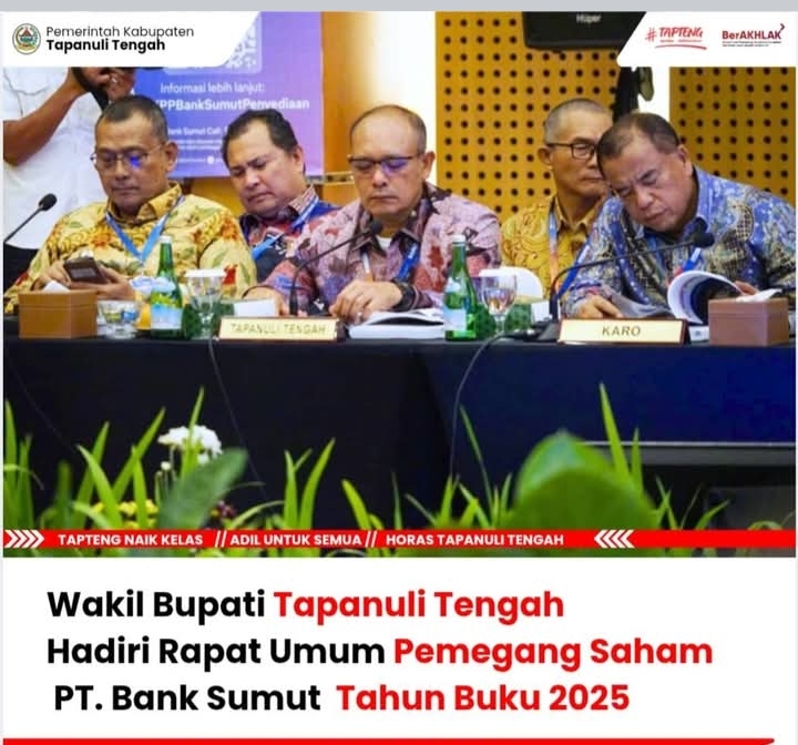MEDAN – Wakil Bupati Tapanuli Tengah (Tapteng) Mahmud Efendi pada hari Senin, 06 April 2026 bertempat di Lantai 10 Kantor Pusat Bank Sumut, Jalan Imam Bonjol Nomor 18, Medan menghadiri Rapat Umum Pemegang Saham (RUPS) PT. Bank Sumut Tahunan Tahun Buku 2025.